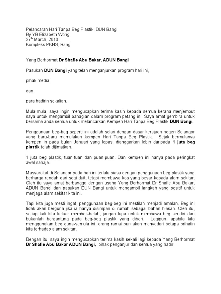 Archive for Hari Tanpa Beg Plastik. Mesyuarat Kedua Penggal Ketiga Dewan Negeri Selangor Tahun 2010. Kerajaan Negeri Selangor telah melaksanakan Kempen Bebas Beg Plastik dan Polistirena bermula 1 Januari 2017.