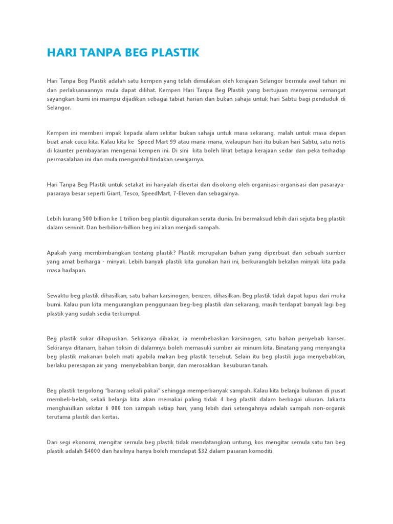 Selama tujuh hari seminggu bermula awal tahun depan berbanding pelaksanaan pada setiap hari Sabtu seperti yang diadakan ketika ini sekali gus mahu mencapai sasaran sebagai negeri bebas bekas polistirena sepanjang tahun 2017. HARI TANPA BEG PLASTIK Hari Tanpa Beg Plastik adalah satu kempen yang telah dimulakan oleh kerajaan Selangor bermula awal tahun ini dan perlaksanaannya mula dapat dilihat. 1072018 Hee Loy Sian berkata cadangan menaikkan caj beg plastik tidak bermakna kempen Hari Tanpa Beg Plastik gagal sebaliknya 20 hingga 30 pengguna menerima baik konsep diperkenalkan Selangor itu.
